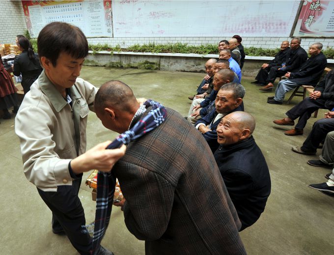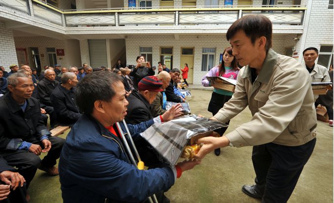 老人见到我们,如同见到亲人般激动,金部长与老人们握手言欢,亲自给老人们带上围巾,并带领大家把慰问品发到老人手中。